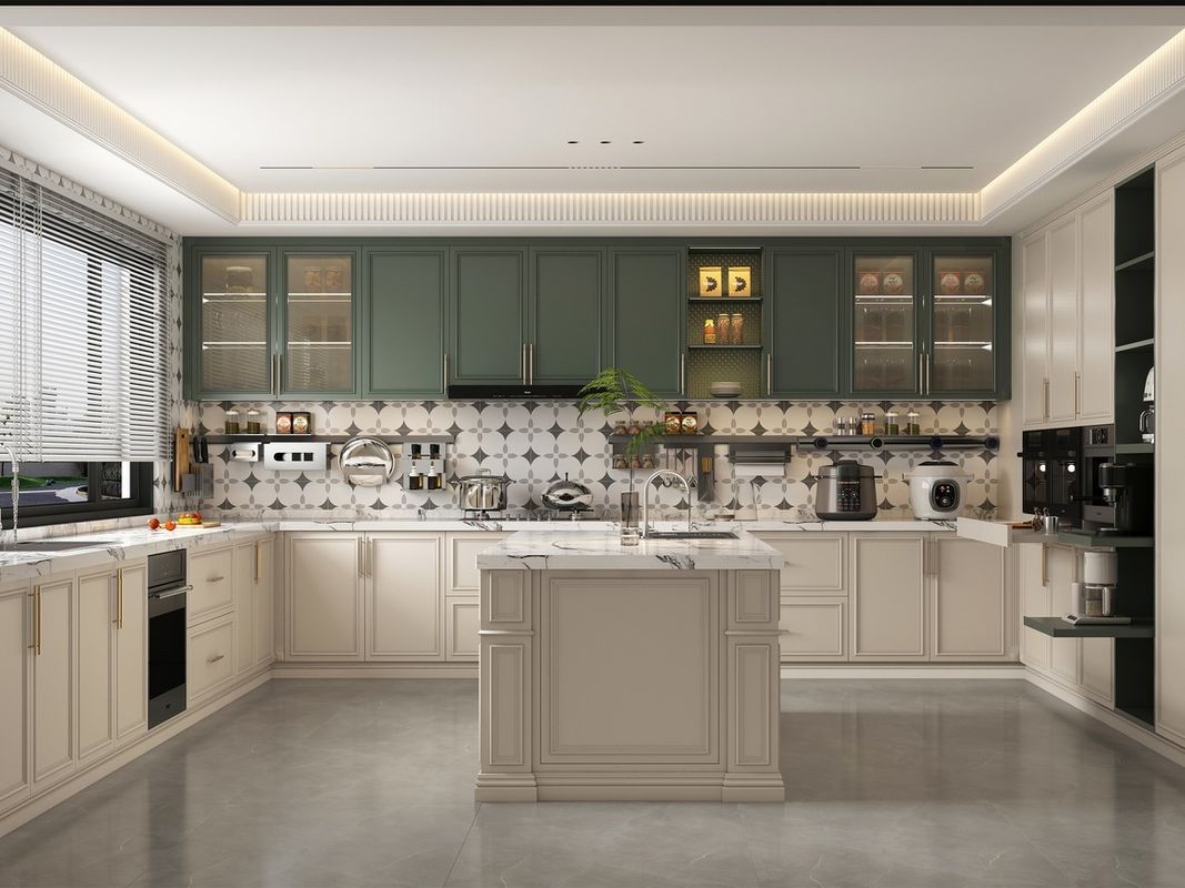 | Farbschema | Weichcreme-Schränke mit tiefgrünen Oberschränken und Akzenten |