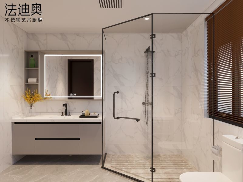 Dieses Bad ist eher ein designorientiertes System als eine generische SKU.Es verwendet Grau zusammen mit Premium Edelstahl Schrankenstruktur eine aufgelöste visuelle Identität für Premium-Wohnprojekte zu schaffen.