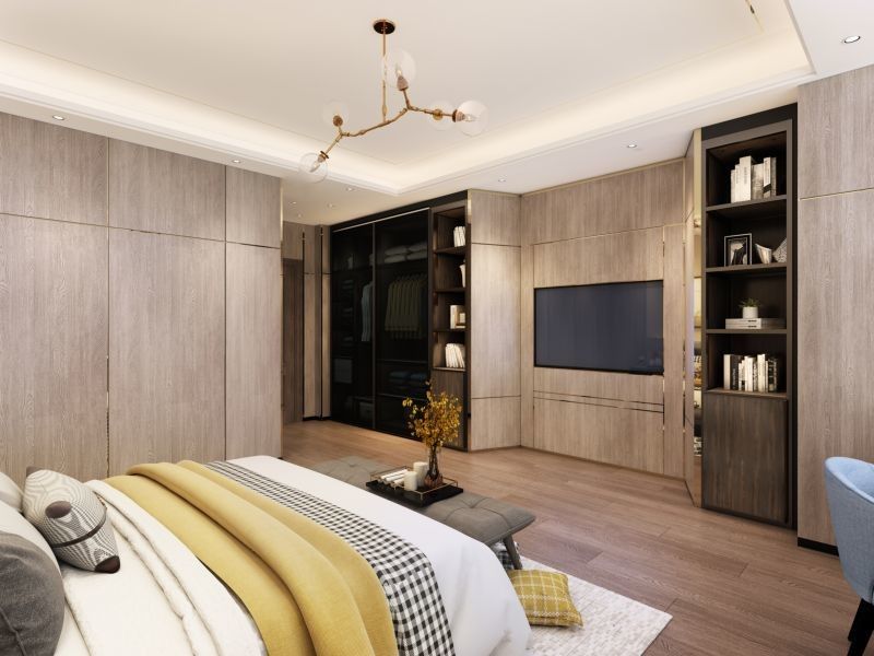 | Gestaltungsmerkmale | Große diagonale Schnitte im Fernsehbereich, nahtlose Integration von Holz- und Metallelementen und ein weitläufiger Schreibtisch |