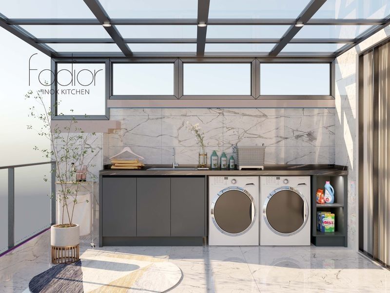 | Aufbewahrungsfunktionen | Beinhaltet einen freistehenden Schrank, Platz für Wasch- und Trockenmaschinen und ein offenes Regal mit integriertem |