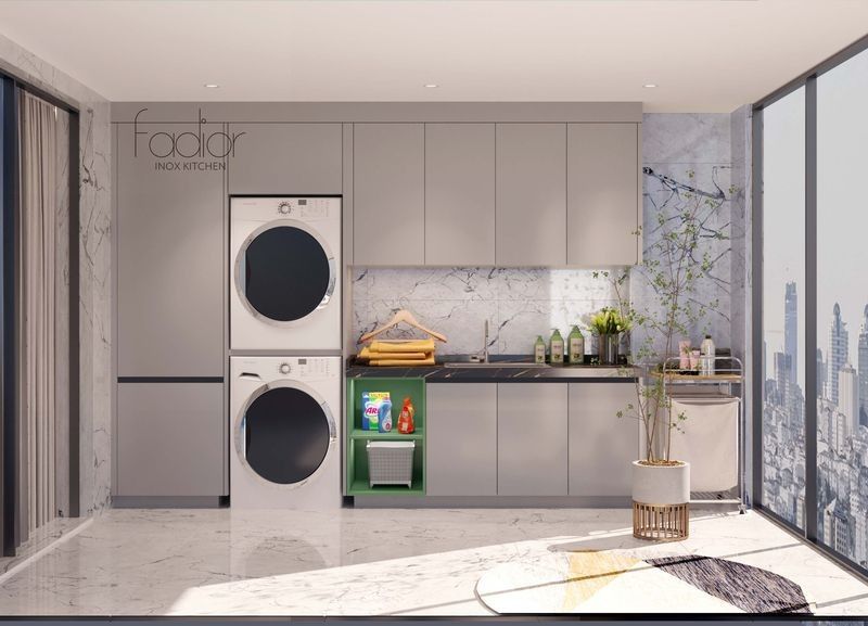 | F: Welche Layoutfragen sind für diese hellgraue Edelstahl-Balkon-Aufbewahrungseinheit am wichtigsten? Die nützlichsten Layoutprüfungen sind die nutzbare Tiefe und die Zugangsplanung zusammen mit der Arbeitsplatte aus schwarzem Quarz. Diese entscheiden, ob die Seite reale Standortbedingungen widerspiegelt und nicht nur eine stilisierte Ansicht zeigt. |