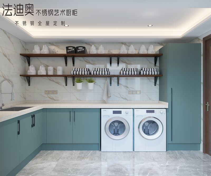Dieser Wäscheschrank wird als designorientiertes System und nicht als generische SKU präsentiert. Er verwendet Teal Matte zusammen mit einer Edelstahl-Schrankstruktur, um eine ausgereiftere visuelle Identität für Premium-Wohnprojekte zu schaffen.