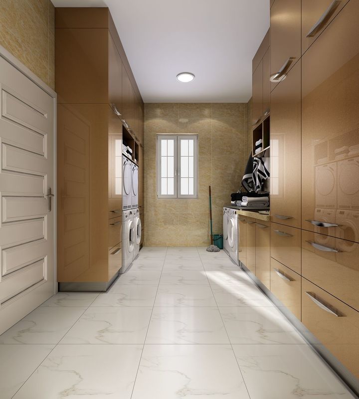 | Speicherlösungen | Dazu gehören hohe Schränke, Oberräume und ausziehbare Schubladen für Waschmittel, Handtücher und Reinigungsmittel. |