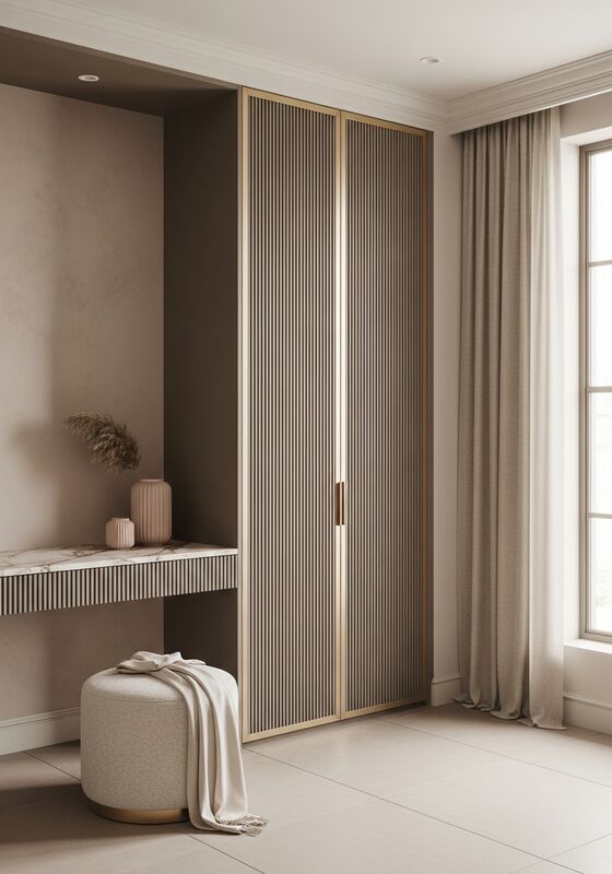 | Design-HighlightsSanfter femininer Minimalismus mit handwerklicher Textur – vertikale Rillen erzeugen subtile dimensionale Interessen ohne visuelle Unruhe, mit warmem Pilz-Taupe als dominierender Farbe, blassen Champagner-Tönen, die mit Vorhängen kompatibel sind, zarten Rosé-Marmor-Akzenten, champagnergoldfarbenen Metallprofilen, disziplinierten Proportionen und vertikalen, mikrogerillten Paneeltüren mit einem Abstand von 15 mm, die einen sanften Schattenrhythmus erzeugen. Die Seite sollte als abgeschlossene Spezifikation gelesen werden, nicht als generische Aufbewahrungsbox. |