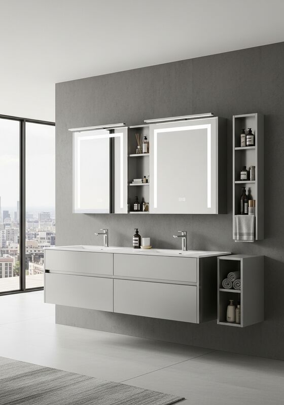 | Größenplanung | Konfiguriert nach den zugelassenen Standortmaßen und wandmontierter Doppel-Vändigkeit mit integriertem Spiegelschrank und offenem Regal, mit vor der Produktion bestätigten Modulbreiten und -freien. |
